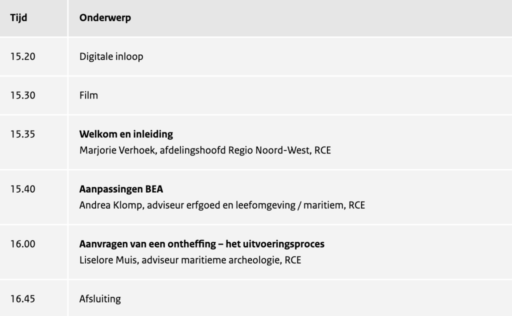 In de online informatiebijeenkomst wordt uitleg gegeven over ontheffingen voor vrijwilligers. Verschillende specialisten van de RCE geven uitleg over de onderzoekshandelingen die met de ontheffing mogelijk zijn. Ook vertellen ze hoe je de ontheffing kunt aanvragen. Daarbij is er ook de mogelijkheid om specifieke vragen te stellen.