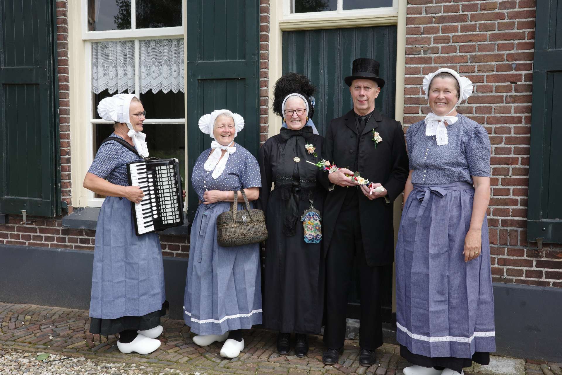 We spreken met danser en voorzitter van de vereniging Bert en zijn vrouw Regina, danser en lid van de kledingcommissie. Beiden zijn gekleed als bruidspaar, in ‘zondagse dracht’. Ook aanwezig zijn secretaris en danser Willy, accordeonspeelster Ineke en Ria, die niet alleen danst maar zich ook bezighoudt met fondsenwerving. De drie dames zijn gehuld in de blauw-witte ‘daagse dracht’ met een polkamuts, speciaal voor de zomer.