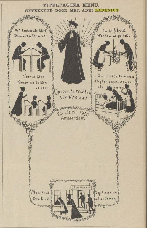 Ze keken haar allemaal aan en de magere vrouw vroeg een beetje spottend: ‘Zouden we ’t beter krijgen, als we ’t kiesrecht hebben?’ Toen legde de blonde vrouw haar boek weg en antwoordde lachend: ‘Ja, zeker, als we ons kiesrecht maar goed gebruiken!’