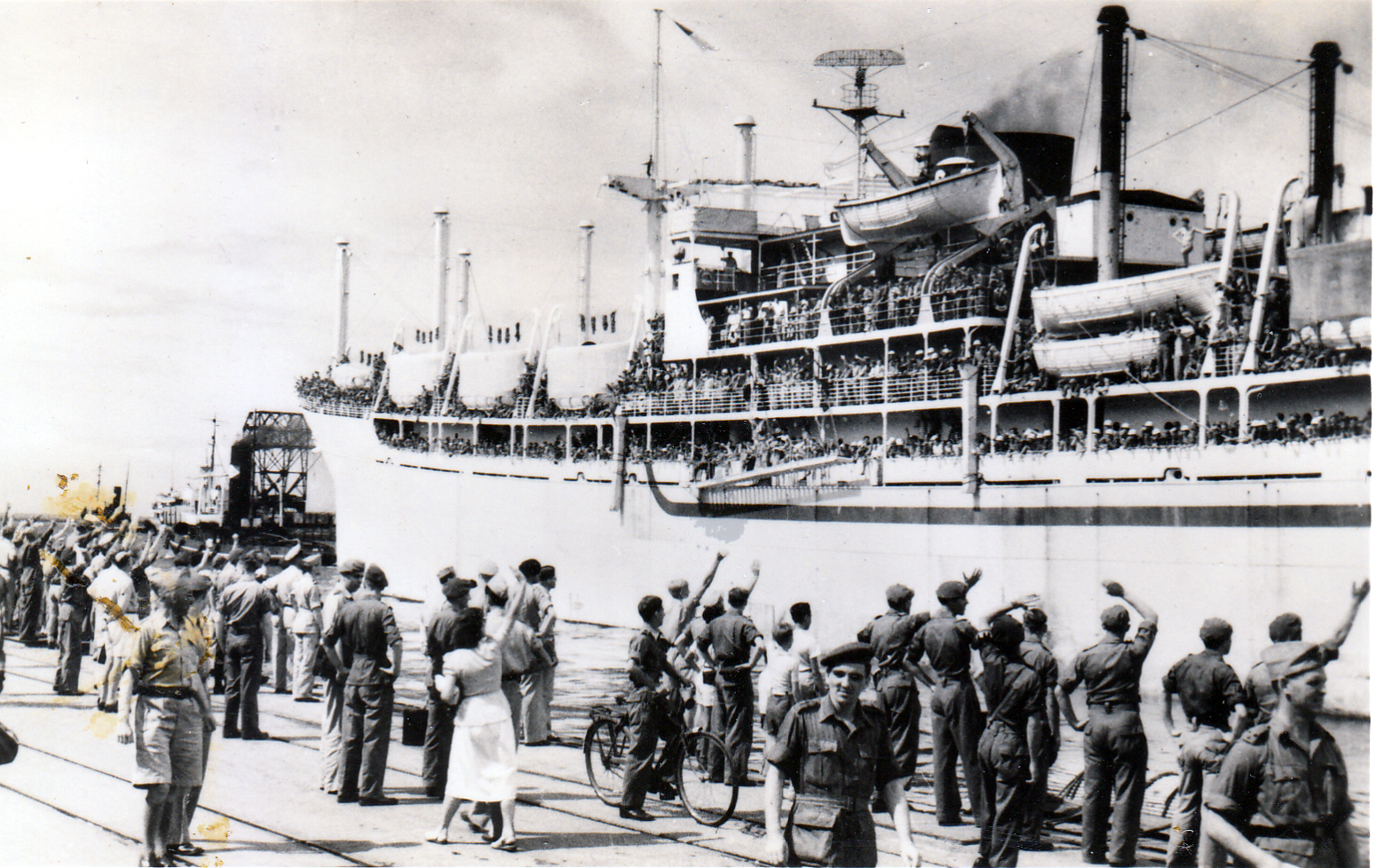 Jan van Dijk: ‘We kwamen met een Engels troepenschip, Nelly, terug uit Indië. Ze hadden soldaten van het Franse vreemdelingenlegioen naar Indo-China gebracht en op de terugweg namen ze Nederlandse militairen mee. De bemanning had op de heenweg wapens gedragen, want ze waren een beetje bang voor dat vreemdelingenlegioen. “Jullie zijn zulke rustige jongens!” Op 1 mei kwamen we in Rotterdam aan, maar we konden de haven niet binnenvaren. Waarom niet? Ze zeiden: “De rooien, socialisten en communisten, staan in de haven met grote banieren met ‘Moordenaars’ en ‘SS-ers’ erop. Dan krijgen we grote trammelant.” Op 2 mei staan zijn we alsnog ontscheept. De familie en het muziekkorps stonden op de kade.