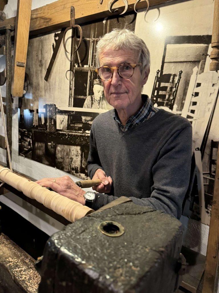 Joan lacht: “Ik hoop dat mijn kleinzoon hier ooit hout staat te draaien. Het doorgeven van kennis en passie is waar het allemaal om draait.”